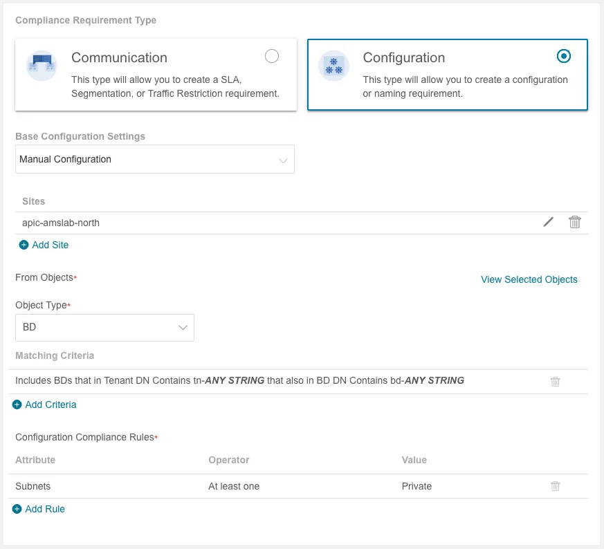 Users of Nexus Dashboard Insights (NDI) can leverage this solution for automated pre-change validation. Hundreds of different checks have been codified and can be used to validate your changes on-demand. Compared to the --rules argument in nac-validate, there is no need to write Python code that contain your checks. NDI will notify you of any anomalies imposed by your new configuration. Besides looking at potential configuration errors, NDI provides a framework that enables users to write their own configuration and compliance rules. Each time a pre-change validation is run, that set of requirements is evaluated. Consider the following examples: