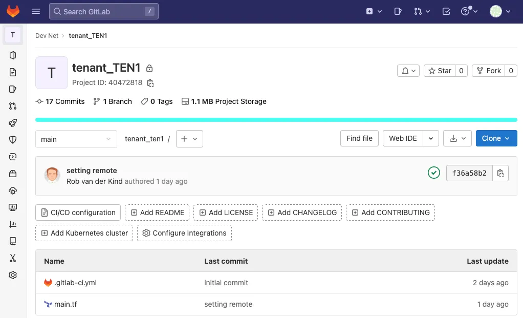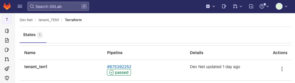 cleanup: extends: .terraform:destroy <<: *clone dependencies: - deployWhen a pipeline is about to run, GitLab generates a unique token and injects it as the CI_JOB_TOKEN variable. This token can be used to authenticate and clone another repository, as long as the token has the right permissions. Each plan only partially passes the data (matching the filters of managed_tenants) to the Network as Code ACI module. Each pipeline will therefore only run against a single tenant. This allows you to work against each tenant in parallel in different workspaces.