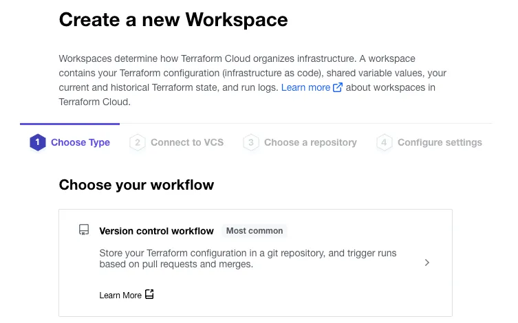 Each folder within the workspaces directory will get its own workspace in Terraform Cloud. In the workspace click new workspace to add a new workspace: