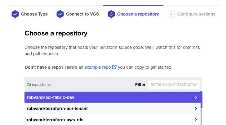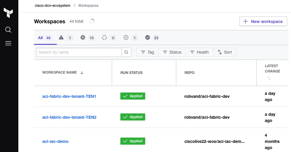 Section titled “Using Terraform Cloud for Business”Terraform Cloud is HashiCorps managed service offering. It manages Terraform runs in a consistent and reliable environment, and includes easy access to shared state and secret data, and access controls for approving changes to infrastructure. Terraform Cloud is available as hosted service at https://app.terraform.io. HashiCorp offers different tiers to consume their features. For more information on pricing, see https://cloud.hashicorp.com/products/terraform/pricing. This section requires access to the Terraform Cloud Business tier as self-hosted agents are a requirement to deploy configuration, as it is unlikely that the Application Policy Infrastructure Controller (APIC)s are exposed to internet. Therefore a local agent is used to execute the Terraform actions.