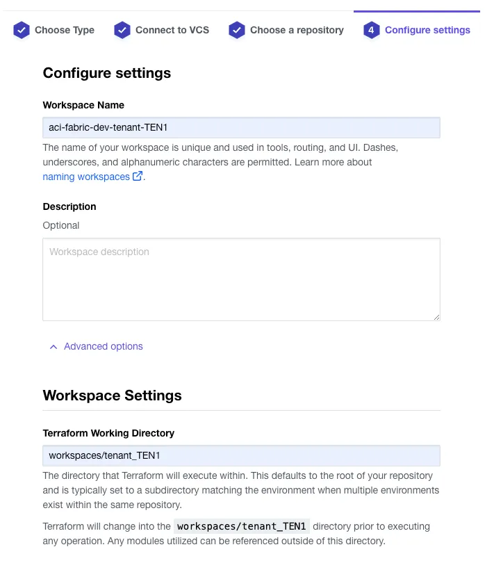 In step 4 of the wizard, provide a new workspace name, expand the advanced options and set the Terraform Working Directory: