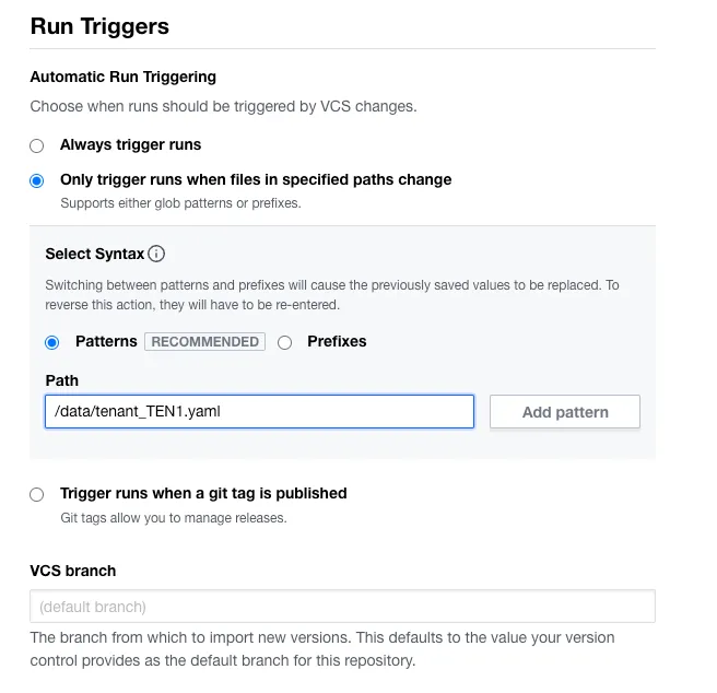 As all plans are part of the same git repository, a run trigger can be configured to only run when files change in specific paths. In this example, the intention is to run the plan within workspaces/tenant_TEN1, when the file data/tenant_TEN1.yaml is updated. You can specificy multiple paths and or files. For more information on VCS and run triggers visit: https://developer.hashicorp.com/terraform/cloud-docs/workspaces/settings/vcs