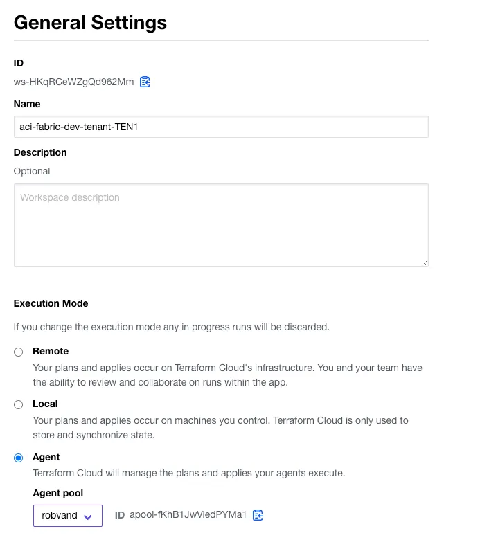 Within the general settings in the workspace change the Execution Mode to Agent and select your pool, followed by saving the settings: