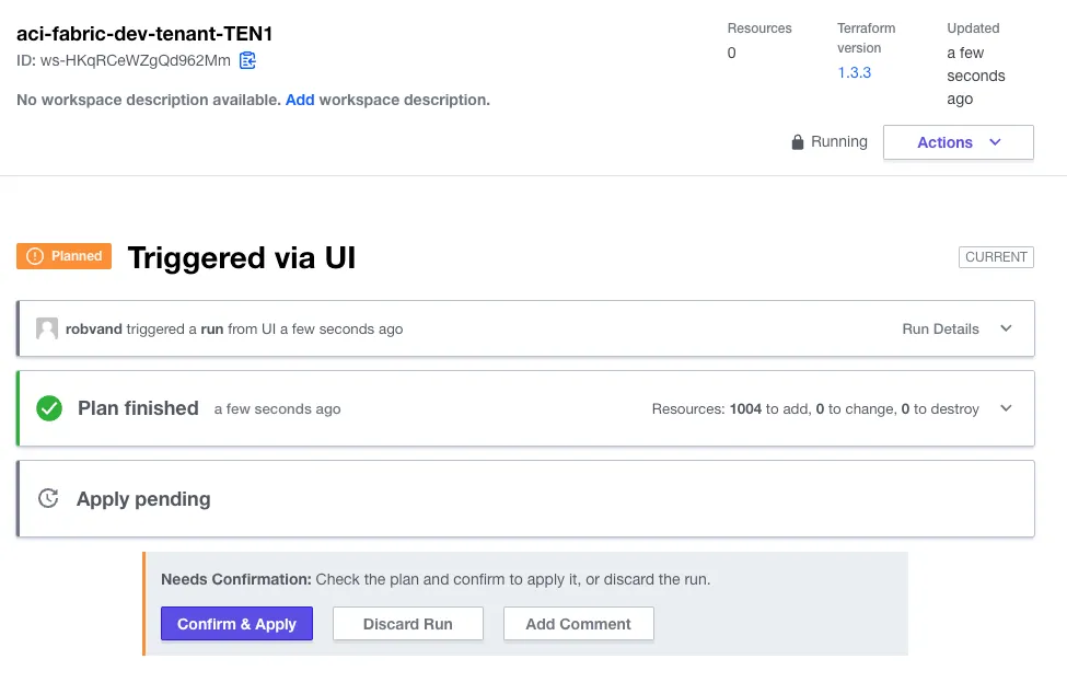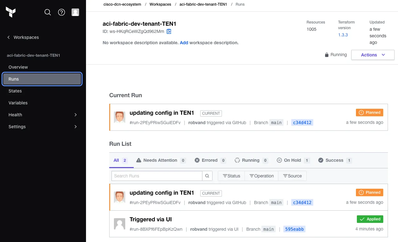 Subsequent changes to the git repository will trigger a run in the workspaces that are watching for specific files to change. An update to data/tenant_TEN1.yaml in the git repository triggered a new run in the aci-fabric-dev-tenant-TEN1 workspace: