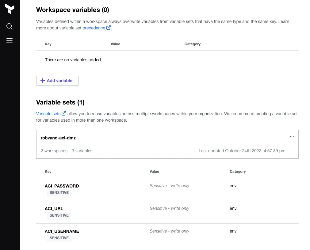 Once you have validated the configuration, proceed with creating the workspace. Add the required workspace variables or use a variable set which allows you to re-use a common set of variables with multiple workspaces: