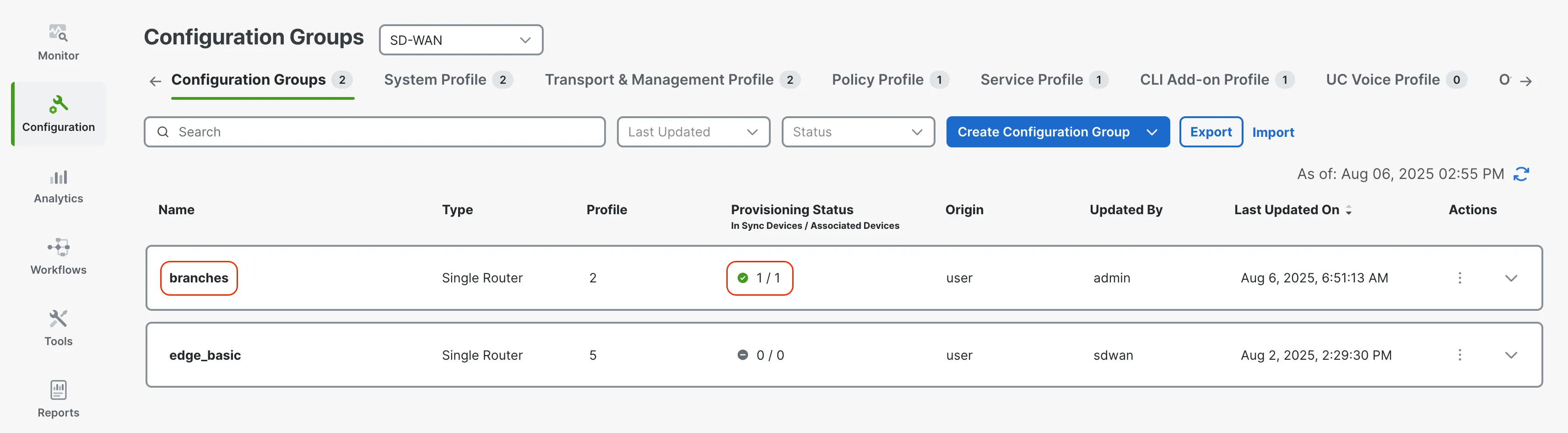Apply complete! Resources: 12 added, 0 changed, 0 destroyed.Navigate to your SD-WAN Manager and verify that your configuration group branches has been deployed successfully: