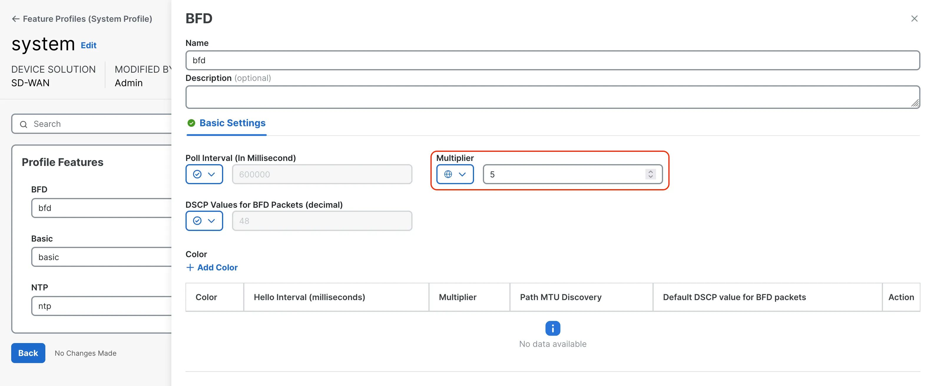 This will update the existing BFD feature with the new multiplier value. Navigate to Catalyst SD-WAN Manager and make sure that the BFD feature was updated with the new multiplier configuration.